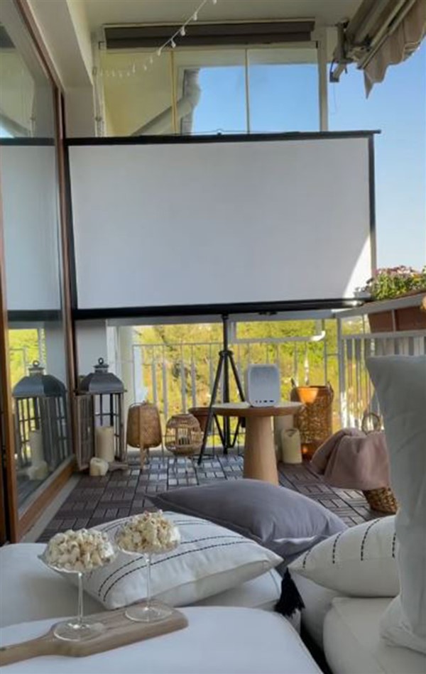 Do not worry about not having a huge space! You might be feeling that an outdoor cinema requires a lot of space. Yet it is possible to adapt the concept to your casual balcony in your apartment. Placing a double sofa and cushions on the ground, a projector, a white screen on the wall will not take up as much space as you think. By placing the screen on the narrow side of the balcony and choosing the right furniture items, it will be possible to create the ambiance of a backyard open-air cinema in your casual balcony in your apartment.
