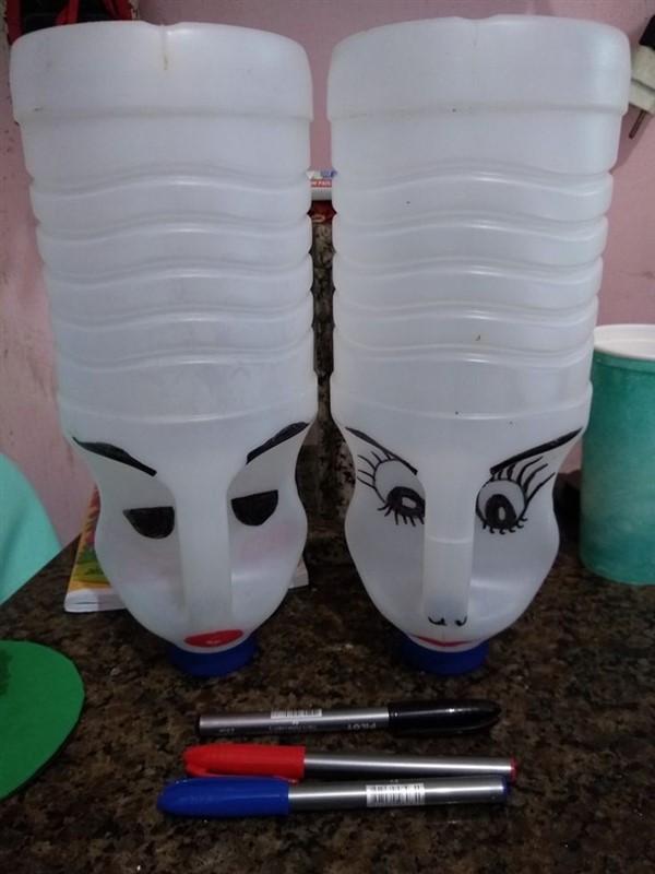 - Paint your bottle with a marker. It will be better to use the handle of the bottle as the nose of the face.