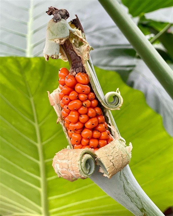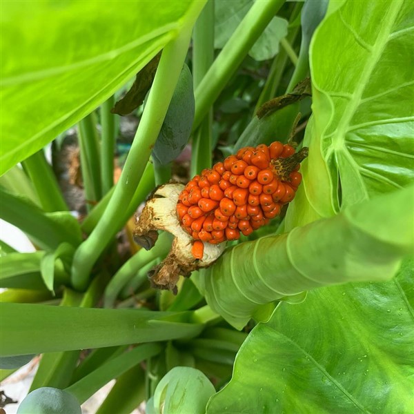 Also known as Giant Taro or Giant Tropic Elephant Ear Plant colloquially, Alocasia macrorrhiza is a plant originally from rainforests of Island Southeast Asia, New Guinea, and Queensland. It has been cultivated in the Philippines and many Pacific islands too for a long time. Known as the cunjevoi in Australia, which is a term that also refers to a marine animal, Giant Taro’s massive, thickly carved forest green leaves which resemble an elephant’s ears, are held upright on eerily hard stems. They are arrow-shaped at the base and stand upright, pointing skyward.