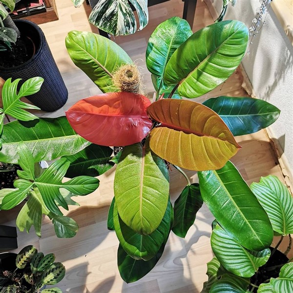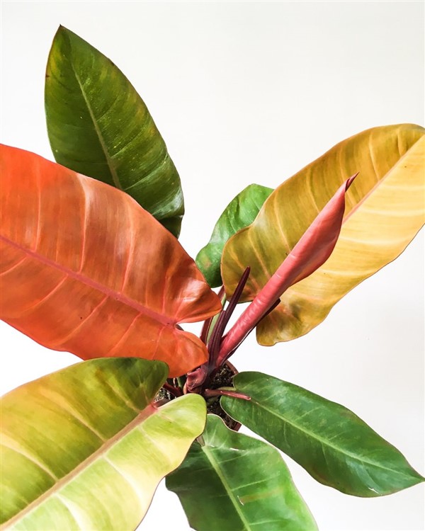 The Philodendron Prince of Orange, also known as “Orange Prince” is an easy-care plant that has stunning glossy bright orange leaves that slowly turn to green as it matures. Therefore the plant will be showing off multiple shades of salmon, orange, and green. Each new leaf develops from the plant’s center since it is self-heading. Expect older leaves to die and fall off as new growth emerges.