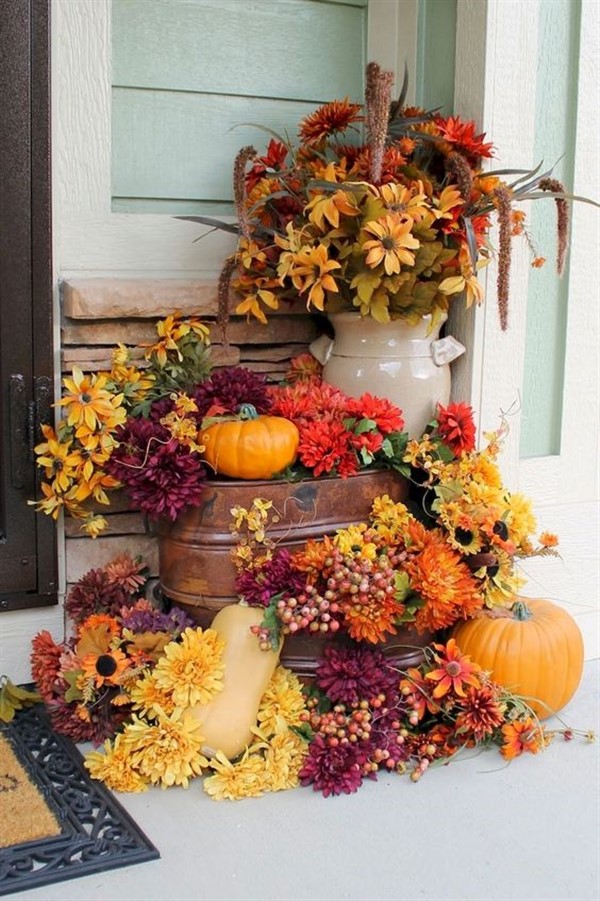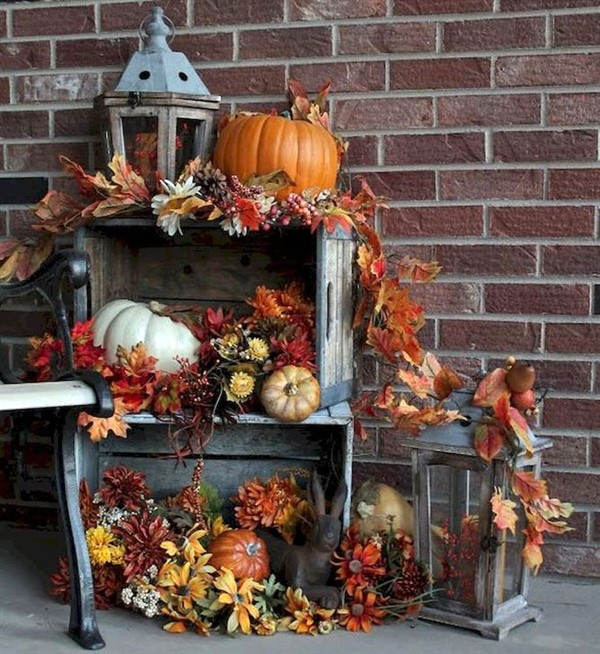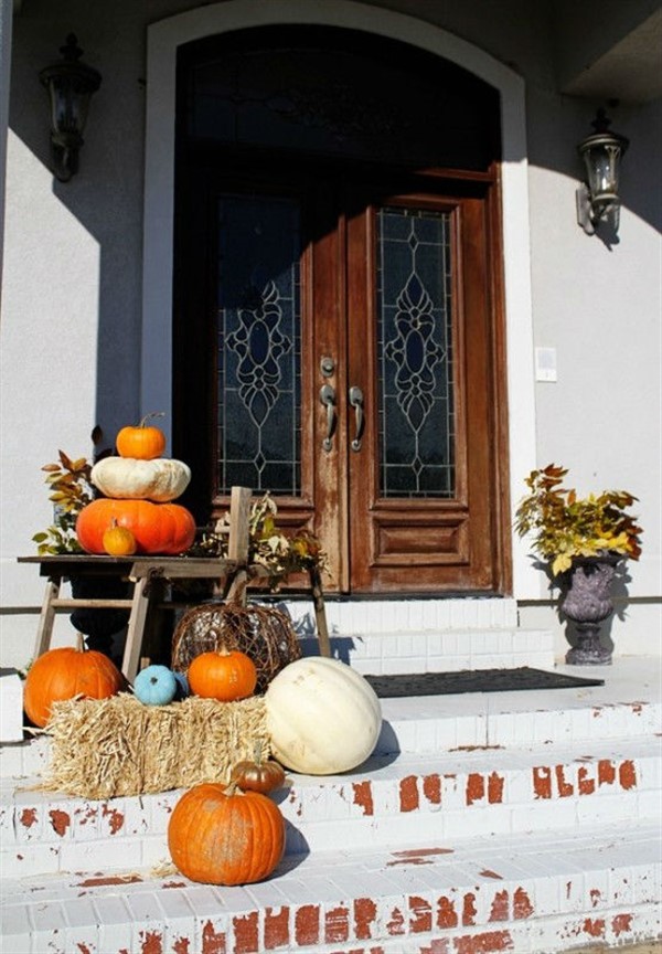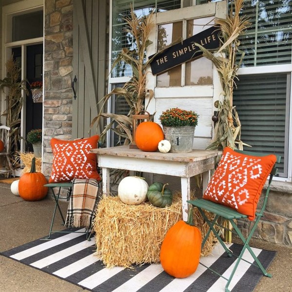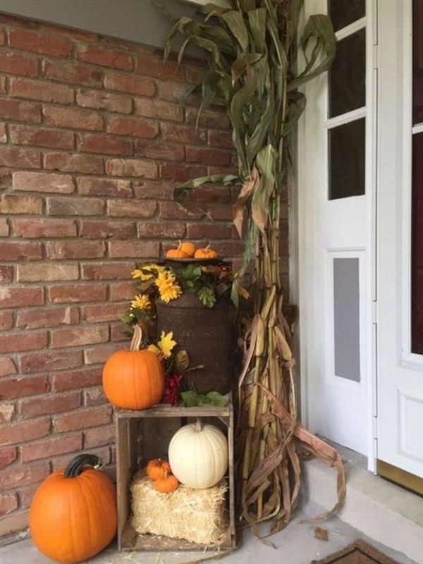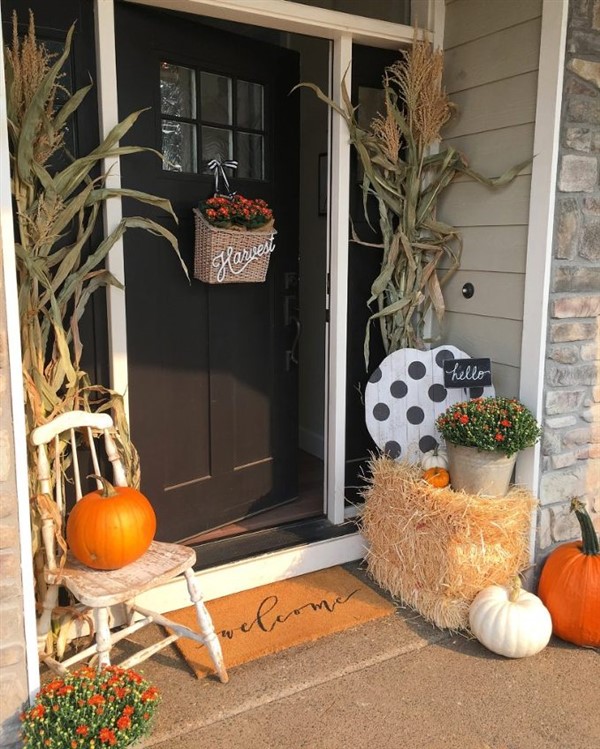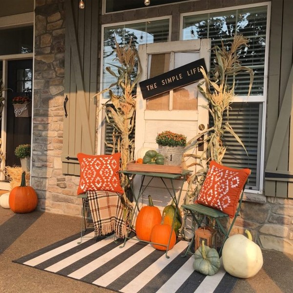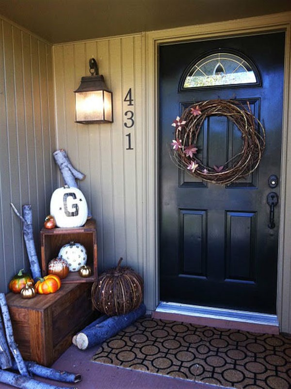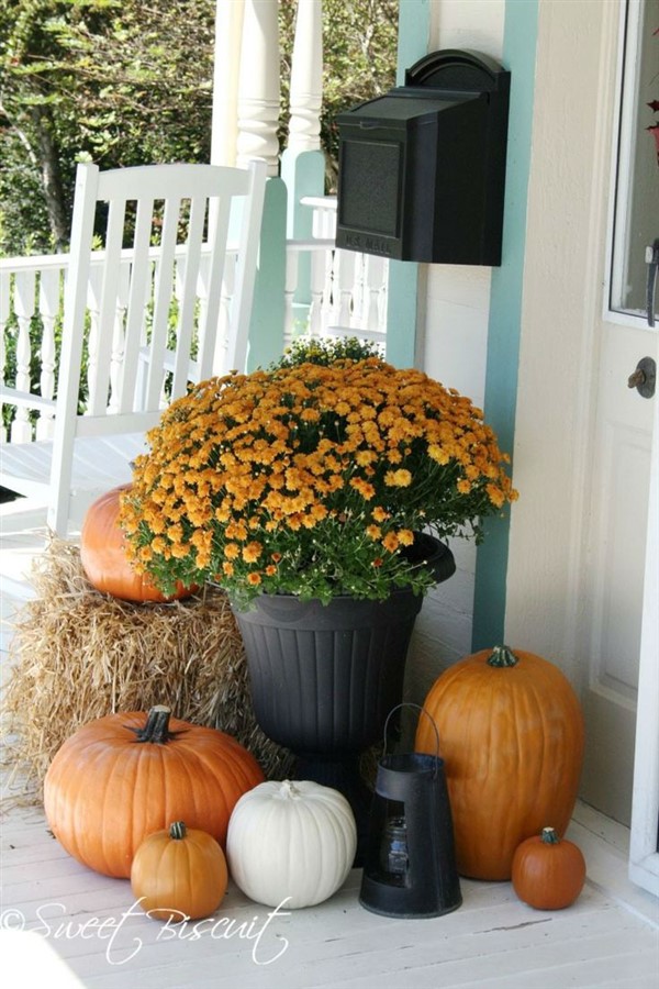 Moreover, fall decoration ideas not only beautify your porch but also you might decorate a corner of your sitting room. What is more, look at these pumpkins and sere flowers. What a lovely decoration 🙂